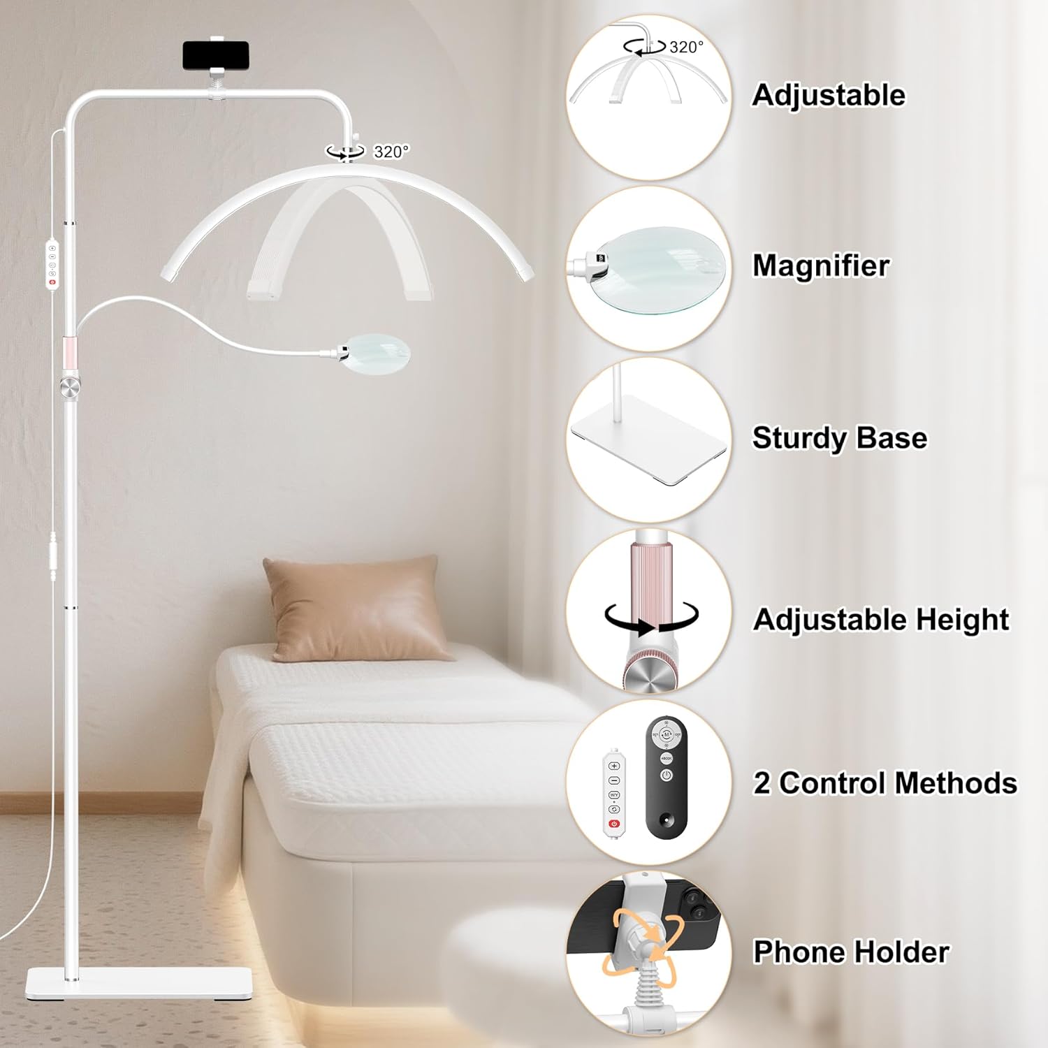 | Included Components | 1*User Manual, 1*DC Adapter, 1*Remote Control, 1*Touch Switch, 2*Rods, 1*Lamp Head, 1*Metal Base, 1*4x Magnifier, 1*Phone Holder |