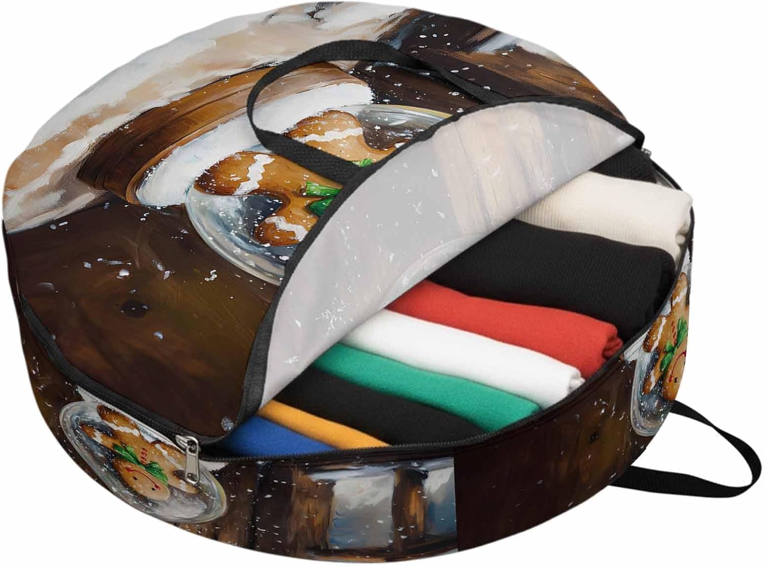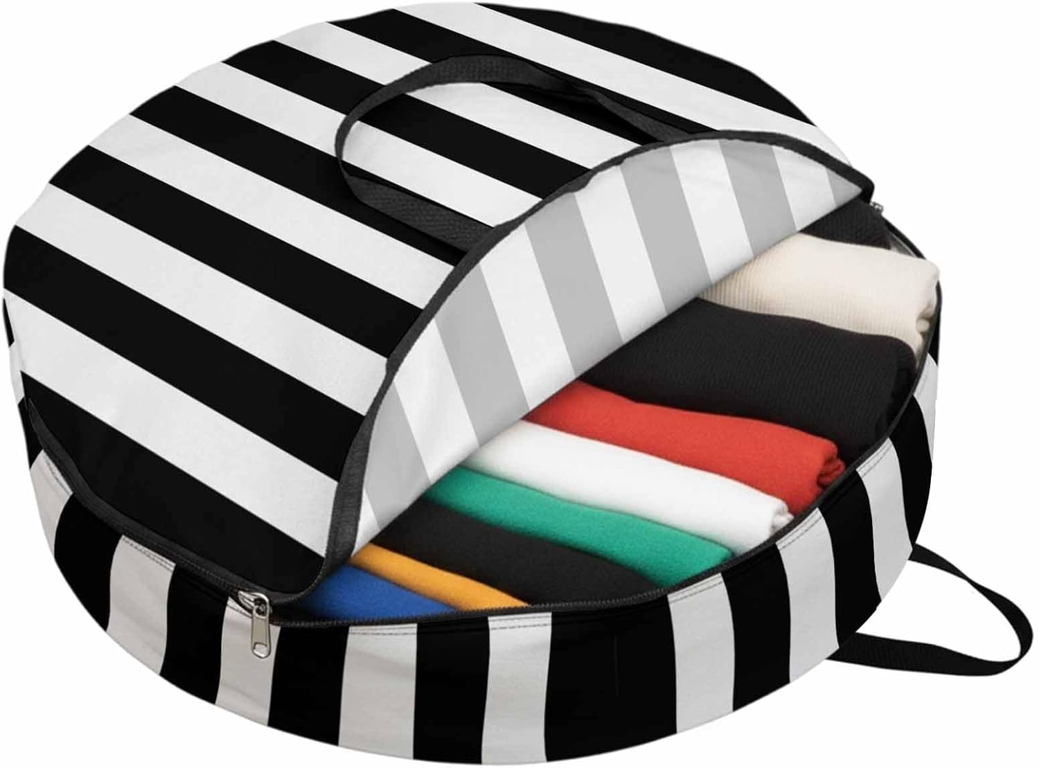 Reclaim Your Closet Space with the Round Storage Solution! Material: polyester Diameters: 24 inch, 30 inch, 36 inch Depth: 7 inches Package Includes: Round Storage Bag One Bag, Endless Possibilities: Whether you are swapping out your summer wardrobe, moving into a new dorm, or packing away holiday decorations, this bag has you covered. The circular design is uniquely suited for: Bedding: Comforters, quilts, sheet sets, and oversized pillows. Clothing: Winter coats, sweaters, and bulky ski gear. Home Decor: Holiday wreaths, garlands, and floral arrangements. Outdoor Gear: Camping blankets, sleeping bags, and beach towels. Dual Zippers: The high quality double zipper design allows the closet organizer to open wide from both sides, making it effortless to load and unload even the bulkiest comforters or wreaths. Reinforced Handles: Sturdy, reinforced handles are securely stitched to provide extra strength and a comfortable grip when carrying heavy loads or pulling the bag from under a bed. Clear Label Pocket: A transparent built-in label holder allows you to quickly identify the contents of each bag without ever having to unzip it, keeping your storage perfectly organized.