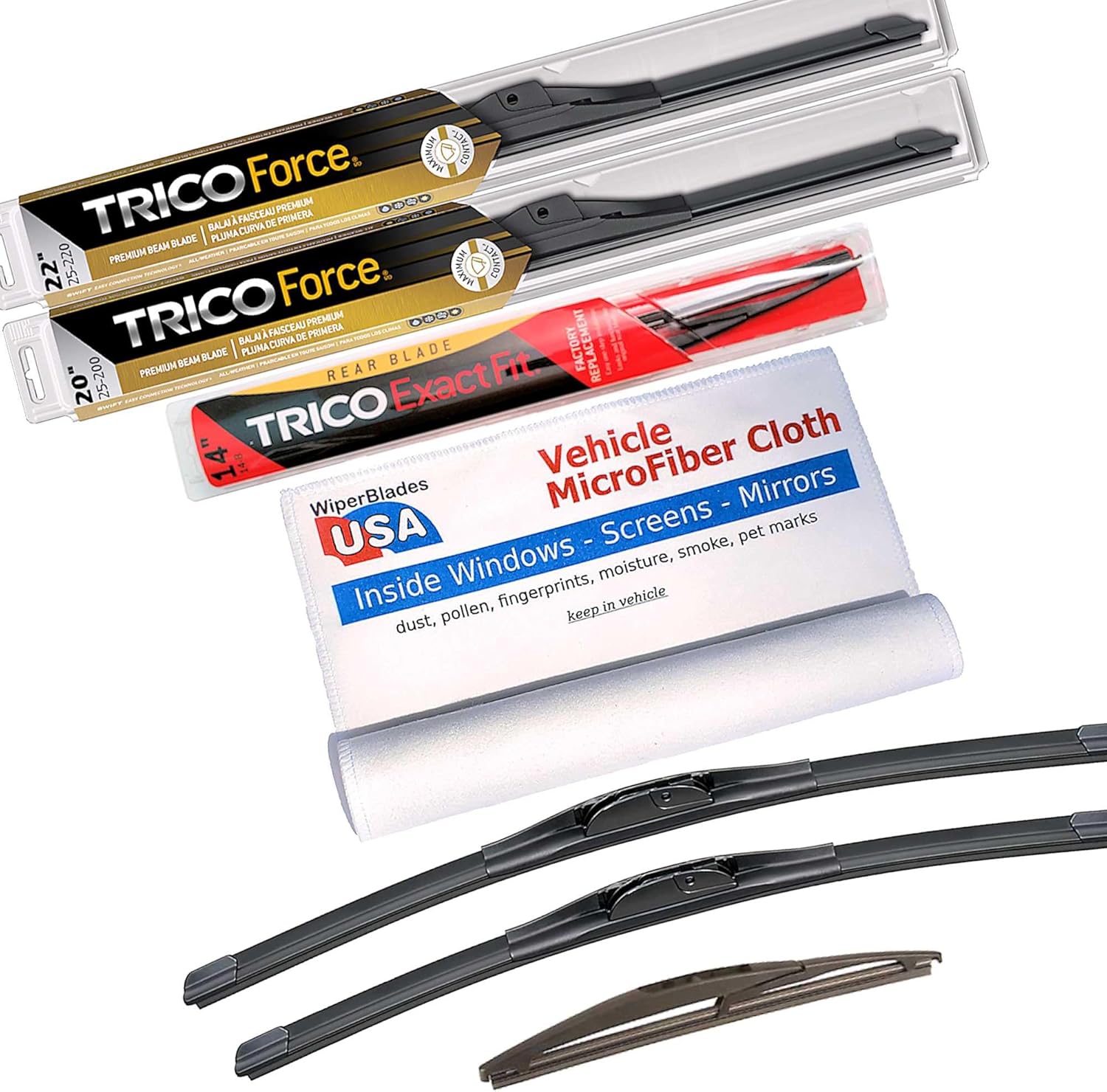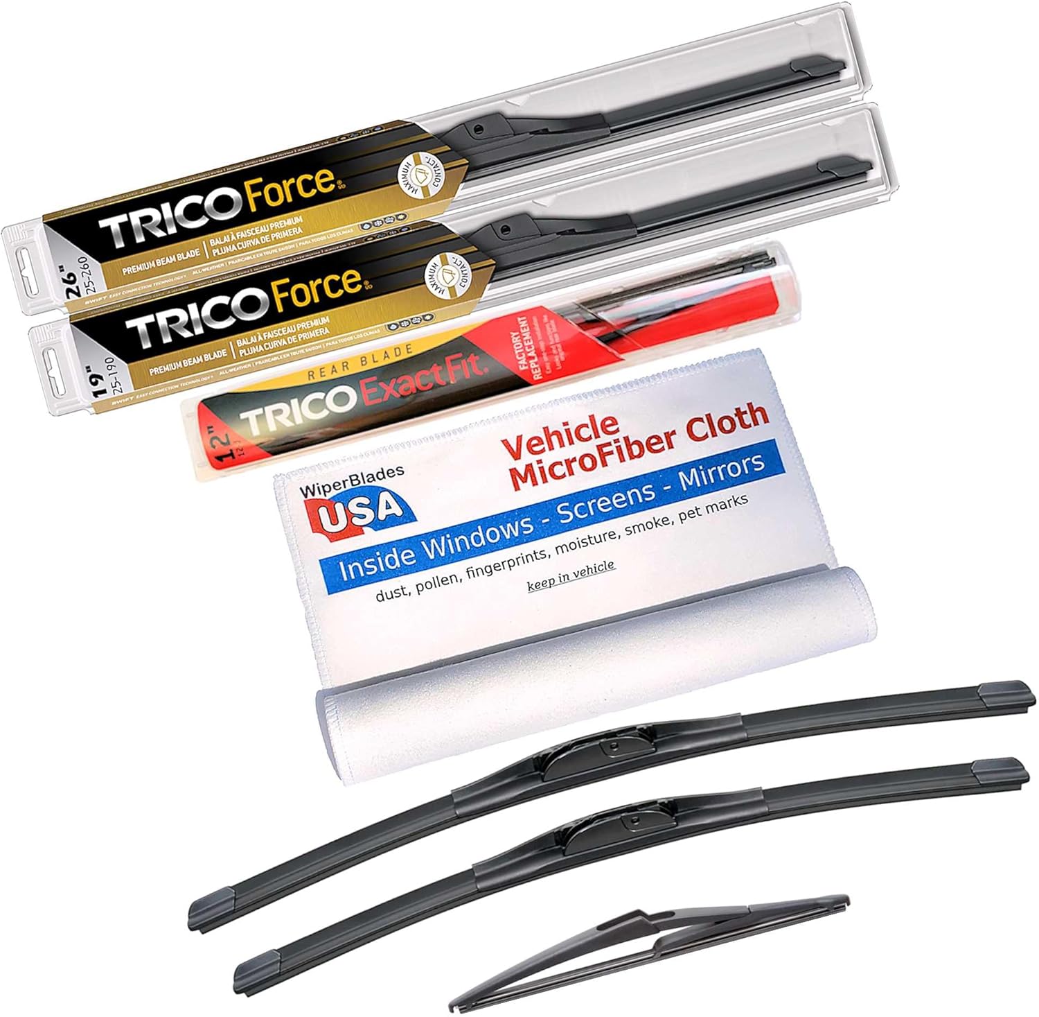 Premium Beam Wiper Blades set +Trico ExactFit Rear wiper. Compatible with Infiniti QX80 2016Trico Force Premium Beam Wiper Blades - "Turning wind force into wiper pressure" These Trico Force Premium Beam Wiper Blades are a great choice and are compatible with your Infiniti QX80 2016 because: When you need "extra" pressure on your wiper blades to keep them stable on your large curved windshield then Trico Force is the premium beam blade for you. Trico Force Wipers are robustly engineered beam blades with a patented swept-wing spoiler that slices through turbulence caused by cross winds, buffeting truck winds and general traffic disturbances. Designed with an innovative aerodesign, these high performance wiper blades control airflow and transfer it into maximum wiper/glass contact for a flawless wipe, providing excellent visibility in all driving situations. VorTec aerofoil converts wind force for maximum windshield contactHighGlide treated rubber element for a smoother, quieter wipeRobust super-structure for durable all-weather performance Memory Curve Steel® beamSWIFT® Easy Connection TechnologyTested to perform over 1.5 million cyclesAnd Trico is the #1 wiper manufacturer in the United States. So you know you can depend on them.