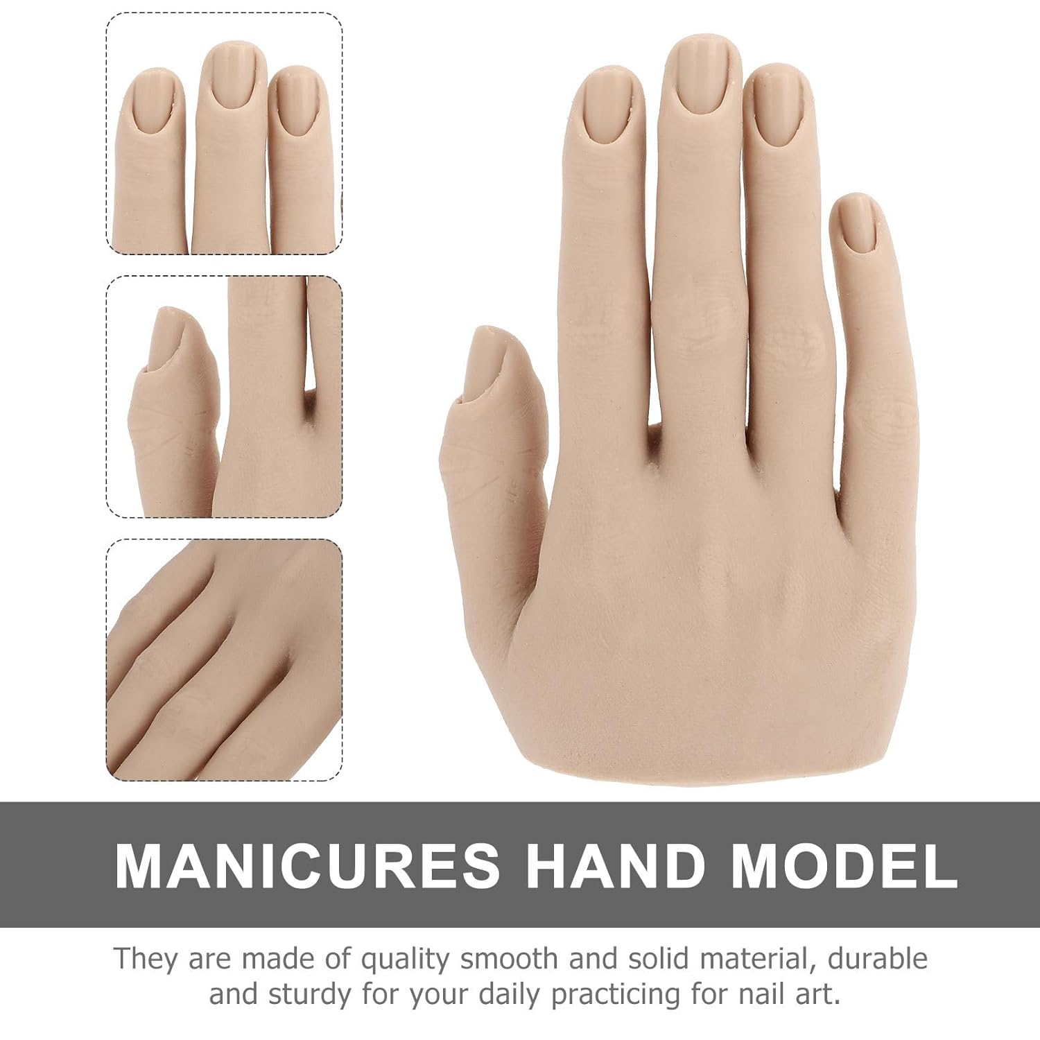 Package List 1 x fake hand model Features - Material: Silicone. - Color: As shown. -Product Info:Manicure hand model - Perfect for nail art beginners, nail art training students and salon artists use finger nails practice. - with good workmanship for high simulation, professional to practice nail art. - An essential tool for nail art design practice and manicure training, begin your nail art design at this moment manicure hand. - Reusable, convenient for nail art practicing manicure training, make you easy to learn manicure nail training hand. - Lightweight silicone material, easy to carry, convenient to practice, practical to use.Goods Descriptionmanicure training hand It is a false hand model which is manufactured especially for manicures training, perfect for beginners.practice mannequin hand D escription Do you admire your friends' good ability in manicures by herself? Do you want to design beautiful nails with professional technology? This item will offer great help to you